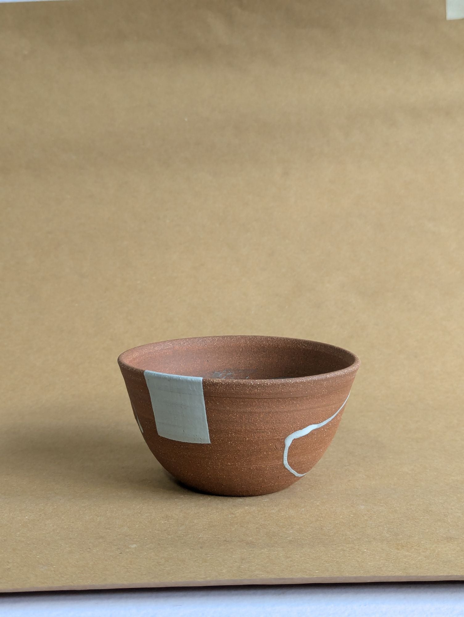 Materials: Wheel thrown red-brown stoneware with hand painted white matte glaze.