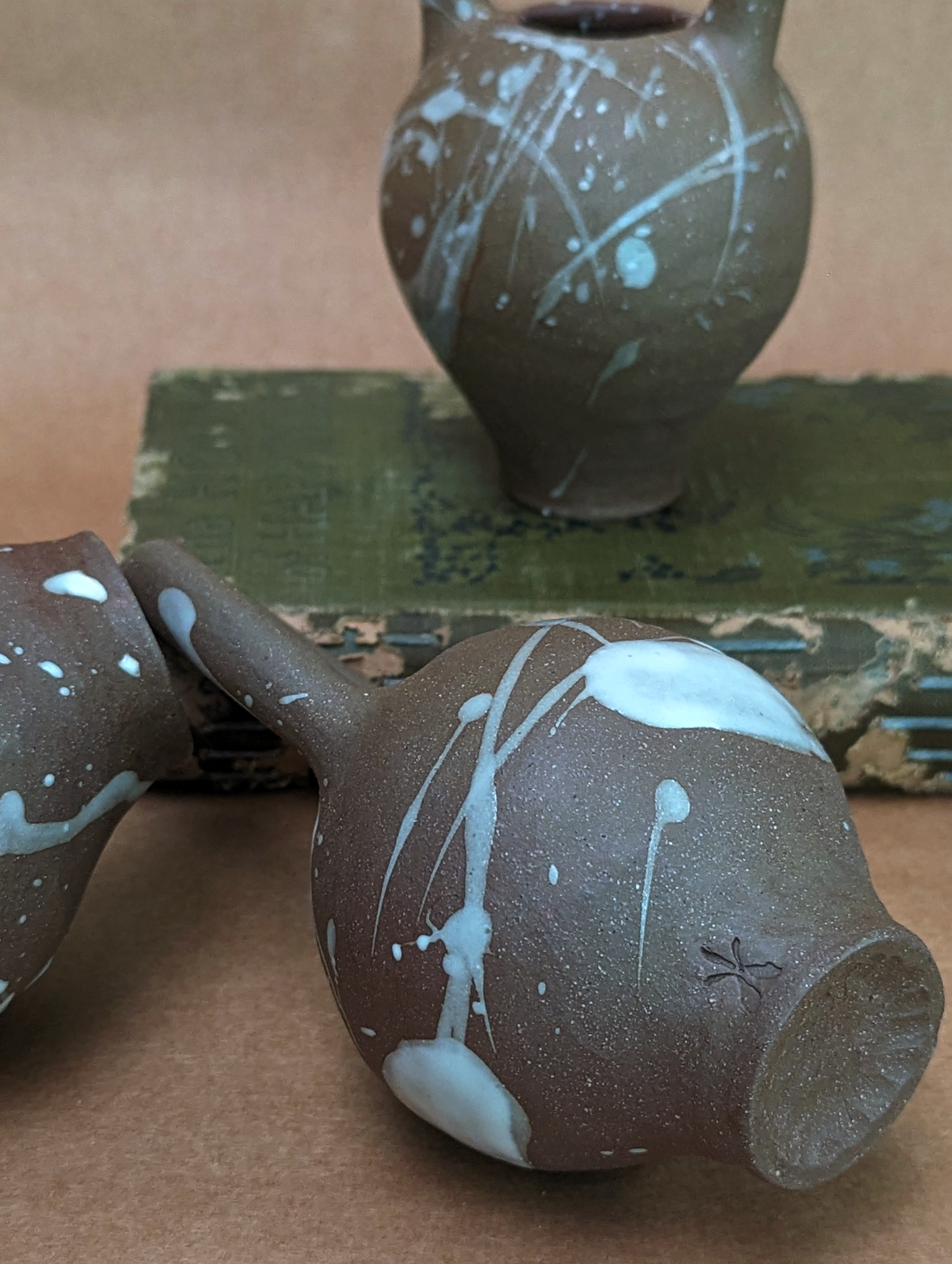 Materials: Coiled brown stoneware, brushed white exterior glaze, interior glaze
